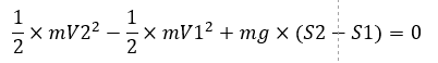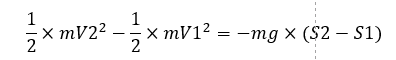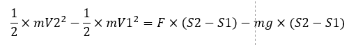경로상의 어떤 점 S1 에서 S2로 이동할 경우 S1에서 S2로 이동하는 동안 물체가 한 일은 S2에서의 운동에너지에서 S1의 운동에너지를 뺀 값입니다. 일은 힘 x 거리 입니다. 힘 F가 작용하는 물체가 S1에서 S2로 이동했을 때 거리는 (S2 -S1)이므로 일은 F x (S2 -S1) 이 됩니다. 그리고 이 값은 1/2mV2^2 – 1/2mV1^2 과 같습니다. 이것을 다르게 말하면 물체에 힘을 주어 거리가 이동이 되면 그 물체에 운동에너지가 생기고 서로 다른 지점의 운동에너지의 차이가 힘에 의해 발생된 일의 양이 되는 것입니다.