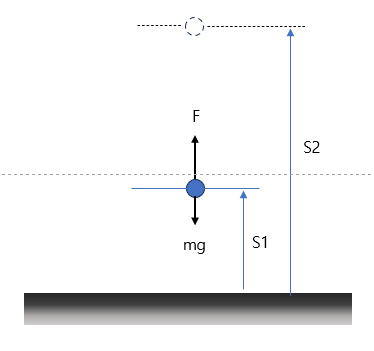 물체를 들어올리는 힘을 F라고 할 때 물체에 한 일은 F (S2 -S1) – mg (S2 -S1)로 표현할 수 있습니다. mg는 중력이고 들어올리는 힘의 반대방향으로 작용하므로 마이너스 부호를 붙일 수 있습니다.