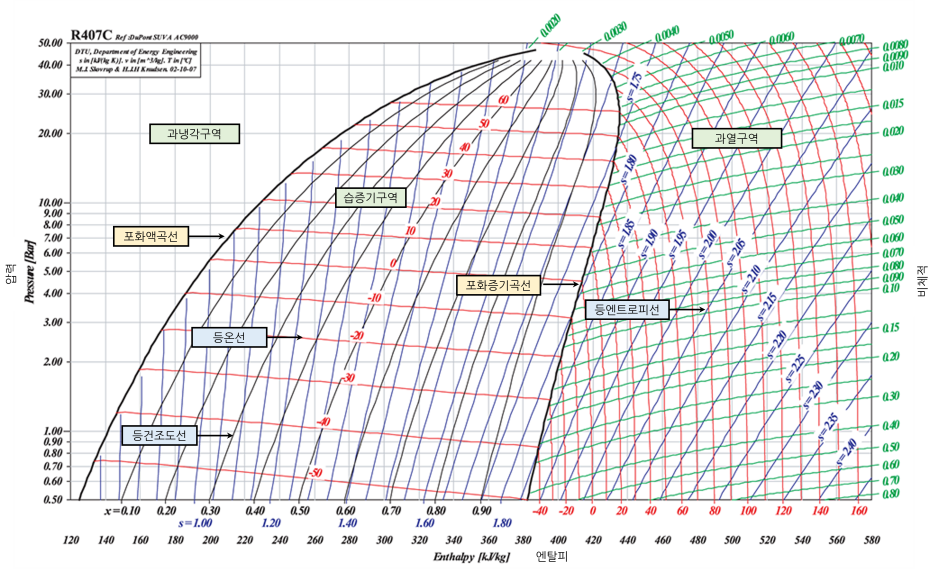 그러면 냉매 중에 R-407C의 몰리에르 선도에 대해 알아보겠습니다. 선도를 보는 방법은 냉매의 종류와 상관없이 동일합니다.