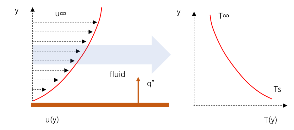 어떤 뜨거운 판이 있습니다. 그 위를 유체가 흐르고 있다고 합시다. 판에서 가까운 곳에서 유체는 유체와 판과의 마찰 때문에 속도(u)가 느리게 나타나고 위로 올라갈 수록 빨라집니다. 판의 표면온도가 Ts 라고 한다면 판에 가장 근접한 유체의 온도는 표면온도와 같을 것입니다. 판에서 멀어질수록 온도가 내려가다가 T∞ 에 도달하게 됩니다.